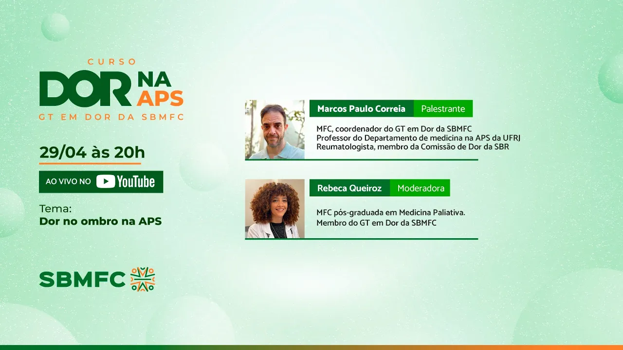 Boa noite gente estamos hoje para mais uma aula do curso dor na PS do GT em dor da Sociedade Brasileira de medicina de família e comunidade em parceria com frj hoje O tema será dor no ombro na atenção primária à saúde e o palestrante de hoje é o Marcos Paulo médico de família e comunidade coordenador do nosso GT do da Sociedade Brasileira de medicina de família e comunidade professor do departamento de Medicina na atenção Primária da frj e reumatologista membro da comissão de dor da Sociedade Brasileira de reumatologia eu vou estar como moderadora hoje sou