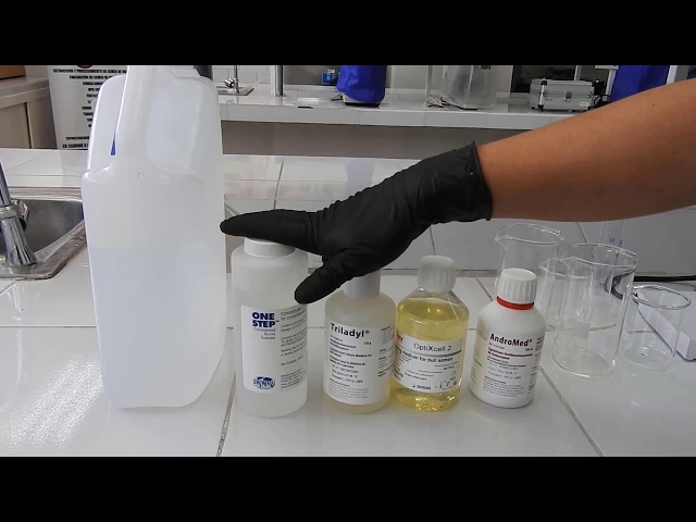 estimadas y estimados estudiantes les doy la bienvenida a una nueva práctica en el laboratorio de reproducción animal el día de hoy aprenderemos cómo procesar y evaluar y congelar semen de diferentes veces el procedimiento que nosotros debemos seguir para culminar con esta práctica es el siguiente en primer lugar vamos a realizar una extracción del semen la cual tiene que ser pues de preferencia con una vagina artificial el segundo paso va a ser un análisis tanto macro como microscópico en donde vamos a ver la calidad de semen que tenemos y vamos a realizar varios cálculos el tercer paso de no hacer una pre de ilusión 1 a 1 vamos a ver si lo realiza el cuarto todos restos acondicionamiento posterior a eso vamos a realizar la dilución final el empaquetado y el sellado del semen la congelación y por último podemos realizar un análisis dentro de los equipos y materiales que nosotros necesitamos para esta práctica tenemos cómo les había dicho vaginas artificiales existen varios modelos dependiendo de la especie de en la que vayamos a trabajar pues tenemos una máquina artificial para bovinos esta es una vagina artificial para caprinos para bovinos tenemos todo el equipamiento de lo que tiene que ver artificiales también necesitamos agua destilada esta tiene que ser un agua de alta calidad agua destilada ocupada en el laboratorio necesitamos también diluyentes de semen ya vamos a conversar acerca de los tipos de diluyentes existen diluyentes que utilizan yema de huevo otros que no la utiliza necesitamos material de vidrio vasos de precipitación probetas también necesitamos unos tubitos de micro centrífuga necesitamos un separador de yema de huevo papel filtro también un agitador magnético con su respectiva varita de excitación necesitamos un termómetro un termómetro para medir las diferentes temperaturas y además un termómetro ambiental que también nos va a servir para tomar la temperatura del ambiente un pequeño término de transporte que vamos a utilizar al momento de de media ley acumulados un contador digital decir unas necesitamos un perímetro digital o papeles o tiras de ph una platina calefactor para microscopio un microscopio óptico en el caso de que no tengamos un contador digital de células vamos a utilizar las cámaras de newark conjuntamente con el contador manual de espermatozoides necesitamos placas portaobjetos placas cubre objetos la tinción de osimani resina necesitamos un set de micro pipetas puntas para micro pipetas para la parte final necesitamos una bomba de evasión necesitamos una jeringa también partidas que es donde vamos a trabajar sm tenemos dos tipos de dos capacidades partidas de 0. 5 centímetros cúbicos y partidas de 0. 25 de primeros cúbicos necesitamos polvo polivinílico para el sellado de las patillas entrar es el lugar en donde nosotros vamos a colocar cada una de las páginas un cooler o una caja de espuma pues para hacer la congelación esta vez lo vamos a hacer de forma manual y también necesitamos tanque un tanque de nitrógeno líquido que contenga precisamente el nitrógeno líquido que va a ser nuestro congelante en este caso para la preparación de los diluyentes y la dilución del semen necesitamos usar estéril en este caso nosotros vamos a utilizar un área que tiene lámparas con los ultravioleta luz que es provista por más lámparas de cuarzo entonces estamos ultravioleta va a cumplir la función de mantener todo el procedimiento este es así como se debe hacerlo en este caso la recomendación es utilizar gafas que tengan protección ultravioleta no se puede reservar a la luz durante mucho tiempo directamente siempre con el uso de gafas y guantes como nosotros habíamos visto ya en el vídeo anterior en donde les expliqué la evaluación de machos para mejorar su fertilidad pues nosotros vamos a utilizar una vagina artificial la cual pues es un tubo que puede ser en diferentes materiales en este caso es un tubo de caucho el cual a su vez tiene una camisa tiene también un color recolector el tubito recolector el cual es un tubo graduado y además tiene unos aros de seguridad el proceso para armar tradición artificial pues es muy sencillo no lo que se hace es introducir la camisa por el interior de la vagina artificial para nosotros tener esta forma una vez que está así lo que nosotros vamos a hacer es con la ayuda de otra persona doblar estos extremos para a su vez hacerlos encajar en la vagina artificial y nos quede pues completamente seguro una vez que nosotros tenemos los extremos ya asegurados lo que vamos a hacer es colocar estos anillos de une para que ejerza una mayor presión en la vagina artificial una vez que nosotros tenemos ya asegurado la camisa de nuestro ángel artificial lo que nosotros vamos a hacer es a proceder a llenar de agua la vagina artificial y también a regular su presión con la introducción de aire nosotros vemos que exista bastión artificial pues presenta una pequeña válvula tiene una válvula grande que es pues precisamente el orificio por el que nosotros vamos a introducir el agua más o menos para llenar nosotros una versión artificial de bovino necesitamos alrededor de un litro del agua la temperatura del agua también es muy importante el agua debe estar a 45 grados centígrados al momento que nosotros la ponemos en la vagina artificial una vez que nosotros sentimos que las paredes comienzan a llenarse con el agua lo que hacemos es regular la presión introduciendo aire por este otro canal que tiene la vagina artificial que es justamente para la introducción del aire esto lo vamos a hacer soplando por este conductor y nuevamente pues vamos a asegurarlo para que quede completamente sedada con la presión y temperatura que se requiera [Música] y a su vez hacer la colecta del cemento finalmente lo que vamos a hacer es adaptar nuestro recolector el cual tiene en su extremo el tubo graduado este tubo pues para el momento de la colecta se recomienda que sea un tubo 