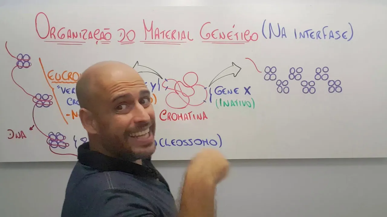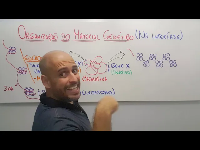 oi galerinha vamos ver agora a gente como é que funciona a organização do material genético durante a interfase mais especificamente na fase g1 do ciclo beleza que quando os genes podem ser ativados ou desativados e é quando o material genético está disso condensado na forma de cromatina para mostrar essa parte o desenho aqui no meio a gente a cromatina aqui é um latina nossa lembro que a cromatina cada cromatina é formada por um ganhado esse daí ela tem começo e fim ou seja ele tem duas extremidades tá falando aqui tipo um bolo de vir aqui