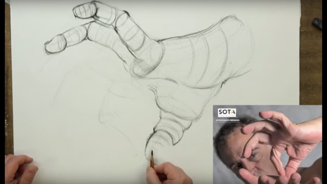 the more you understand about perspective And about cylinders the more you can draw that hand more believable what if we were drawing a cylinder where it slightly was coming towards us but slightly up and maybe a little bit to it at an angle so i could do this i might gesture out the direction here say i want to do that but i want to be pretty round so here's the back cylinder here Then i might bring up depending on how wide i bring it up that might tell me how close it's coming to me or