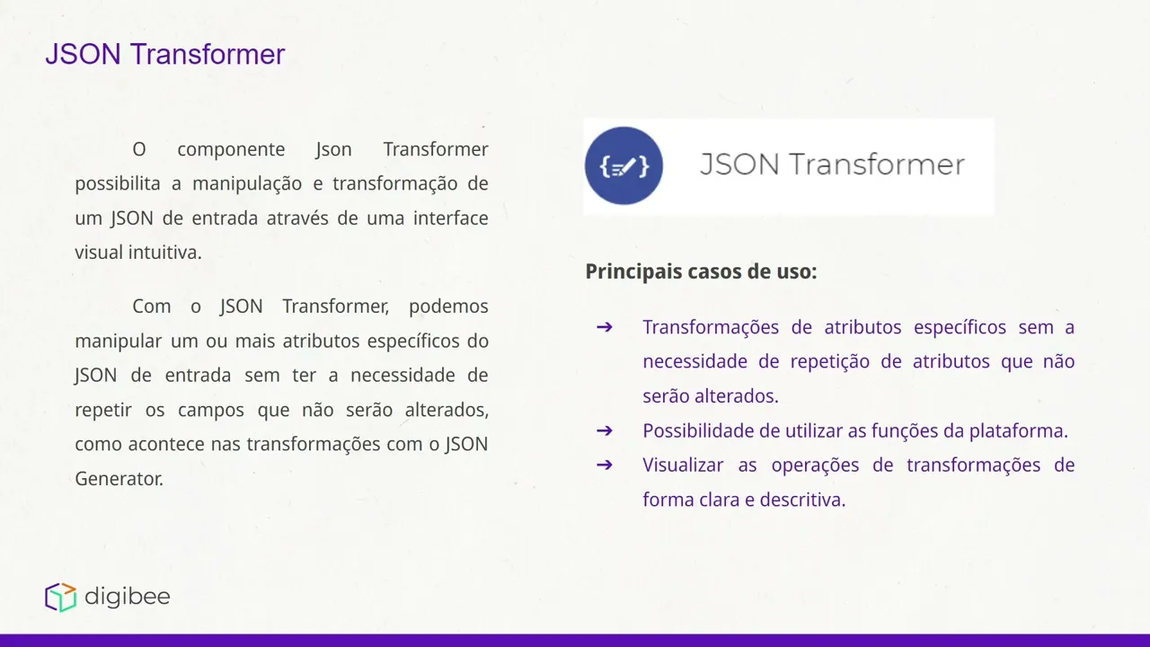 Olá esse é o integration developer bootcamp estamos a etapa de unboring fazero uma revisão do curso foundation nesse vídeo falaremos do Jason Transformer um componente de transformação da plataforma o Jon Transformer possibilita a manipulação e transformação de um Jon de entrada através de uma interface visual intuitiva com o Jason Transformer podemos manipular um ou mais atributos específicos do json de entrada sem ter a necessidade de repetir os campos que não serão alterados o que acontece nas transformações com Jason dinat os principais casos de uso e as principais vantagens do G Transformer são transformações de atributos