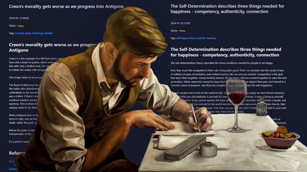 if you have an interesting thought just randomly you can write about it and reference yourself as the source for example while reading Gilgamesh a question popped into my head that was kind of unrelated and it was question of like to what extent is the child success also the parent success if at all so how much is the child's individuality tied into the parents individuality what is that link is there a link at all how should we credit it just a side thought but I figured that's interesting enough to write an atomic note on so I