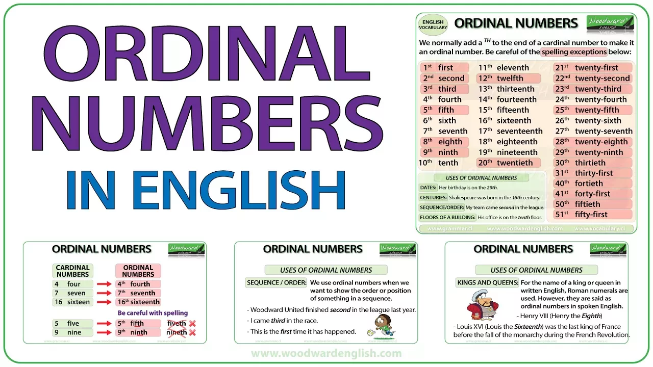 Sequence or order. We use ordinal numbers when we want to show the order or position of someone or something in a sequence. Woodward United finished second in the league last year.