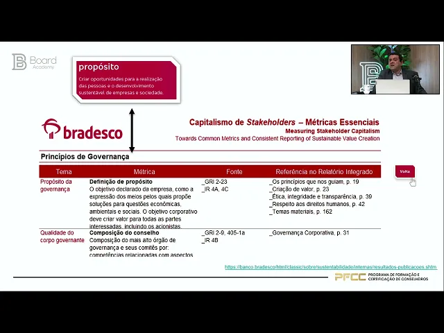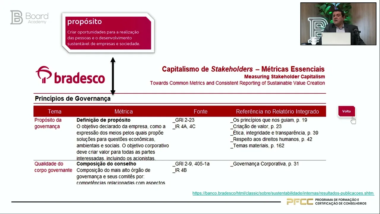 é risco de negócio como é que a nossa empresa quer ser vista cabe a nós tomar essa decisão eu tô destacando aqui agora algo que é parece simples mas é de grande profundidade no pensar dos negócios que é a questão do Propósito nós falamos muito no mundo da governança sobre propósito e estratégia as empresas precisam de propósito sejam elas microempresas ou grandes empresas aqui vocês estão vendo que o propósito do Bradesco é criar oportunidades para realização das pessoas e o desenvolvimento sustentável de empresas e sociedade esse propósito é para inspirar inspirar as partes interessadas que