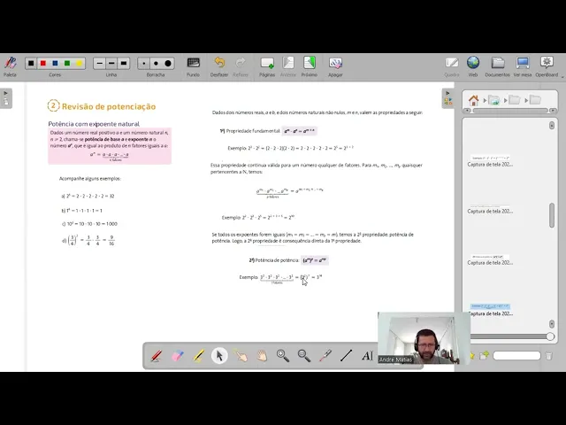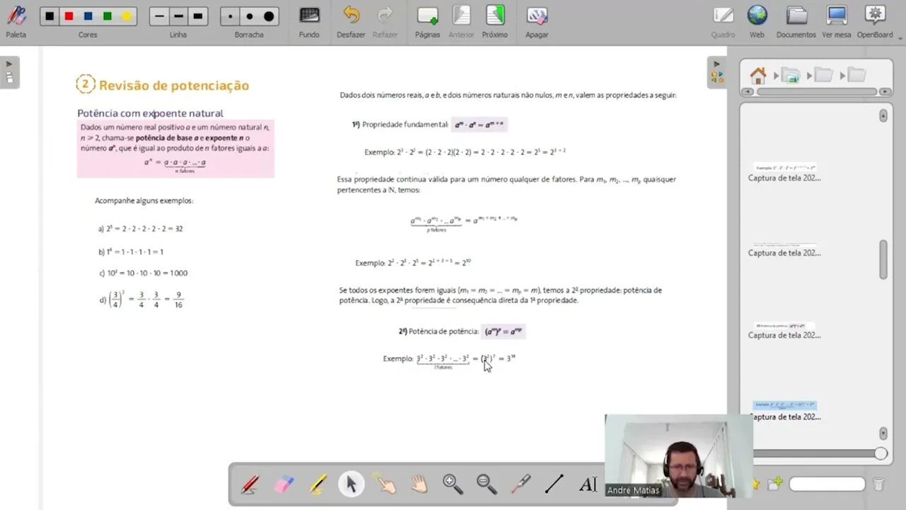 é o 2 x 2 x 2 o 2 5 vezes 1 elevado a 4 1 x 1 x 1 x 1 e assim por diante você pega a base que é o número embaixo e multiplica por ele mesmo quantas vezes apareceu o valor do expoente ó dados dois números reais a e b e dois números naturais não n m n valem as propriedades a seguir primeir verdade a elevado a n x a elevado a n a elevado a n x a elev n você observa aqui a base é a mesma nós vimos aqui que a