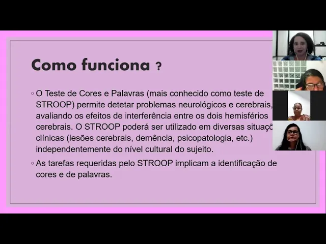o segundo são palavras falando das cores e o terceiro são palavras de cores diferente e Para justamente aí você mede o tempo dessas atividades e depois faz seu trabalho nessa trabalho de avaliação aí então é uma prova sensível para investigação da flexibilidade cognitiva e controle inibitório é o tempo todo a cognição é impressionante assim como você olha assim o negócio escrito Preto nós tá em vermelho você quer falar Preto né é esse peste foi criado na década de 30 a ver não sofre psicólogo e tem um sobrenome dele né Stop que realizou envolveu como o