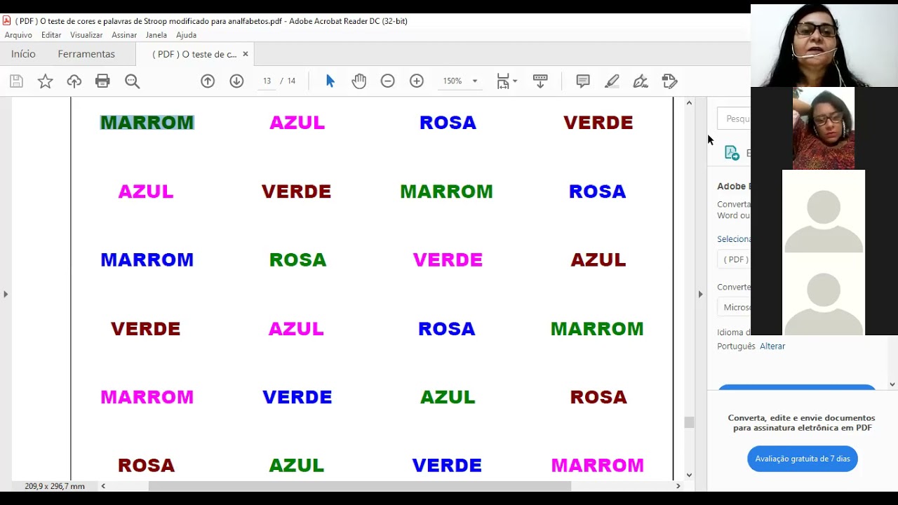 para responder o teste vejam que nós somos alfabetizadas não é um tempinho já e Tivemos alguma dificuldade no começo para entender depois que entendemos se passarmos adiante o teste Nelma a questão é que porque pelo fato da gente já ser Alfabetizado já tem um certa uma certa idade a gente já internalizou essa questão das cores pelas palavras é e as dificuldades da gente é porque já tá algo internalizado dentro da gente entendeu Talvez uma criança menor o menor idade entendeu possa ser que ela faz o teste eu acho que ela caiu Oi A menina é