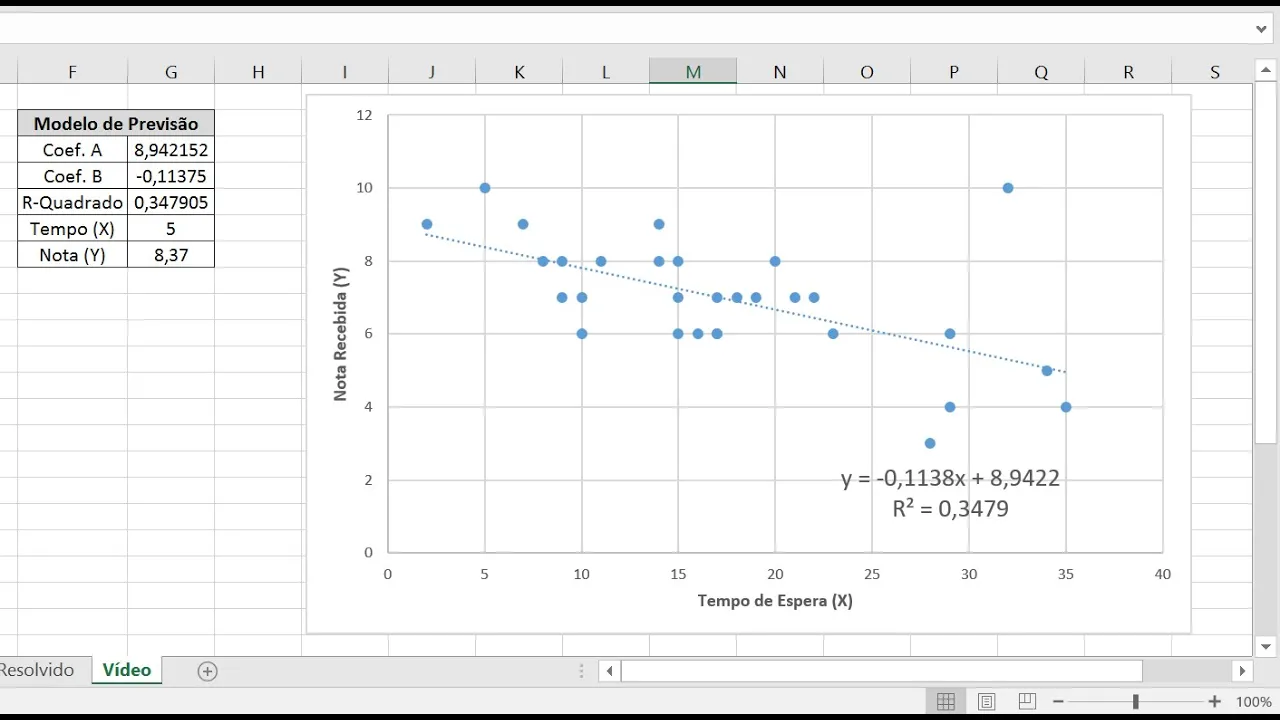 esse modelo aqui pode ser utilizado para fazer previsões de notas dado um tempo de espera de algum cliente ou de um conjunto de clientes outra coisa interessante é que esse é real quadrado que é o coeficiente de determinação ele é uma medida de quão distante os pontos estão da reta de regressão se os pontos estiverem muito distantes esse é o quadrado vai dar próximo de zero se os pontos estivessem perfeitamente distribuídos sobre a linha de regressão esse é o quadrado daria um tá daqui a pouco a gente vai falar mais sobre ele antes vamos falar
