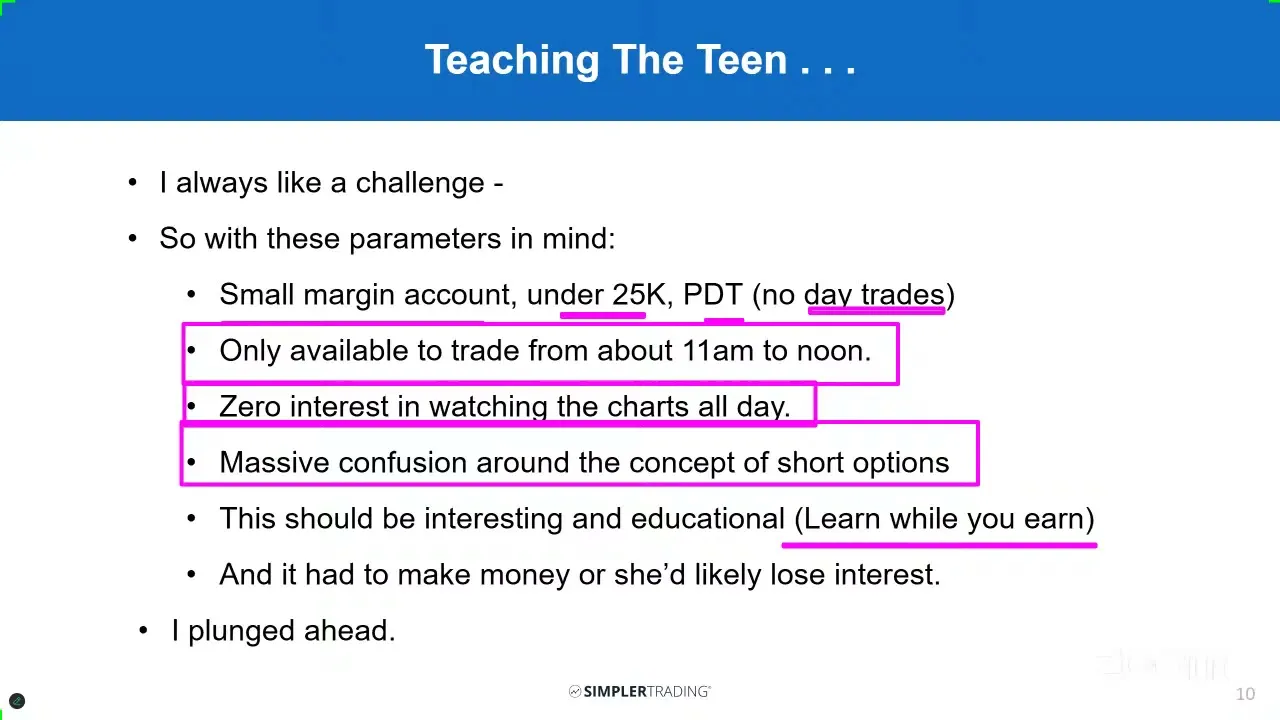 it's going to be a margin account it's going to be under 25k so that means pattern day trading rules are in effect and that also means no day trades um she is only available from about 11:00 a.m. to noon and then you she does have she does she's homeschool she has stud and things like That too and then also sometimes into the last half hour zero interest in watching the charts all day massive confusion around the concept of short options all right and so I looked at this is this is a situation where you learn