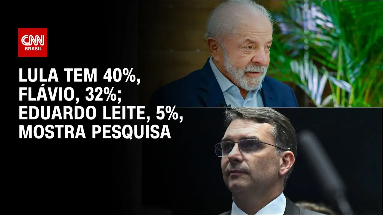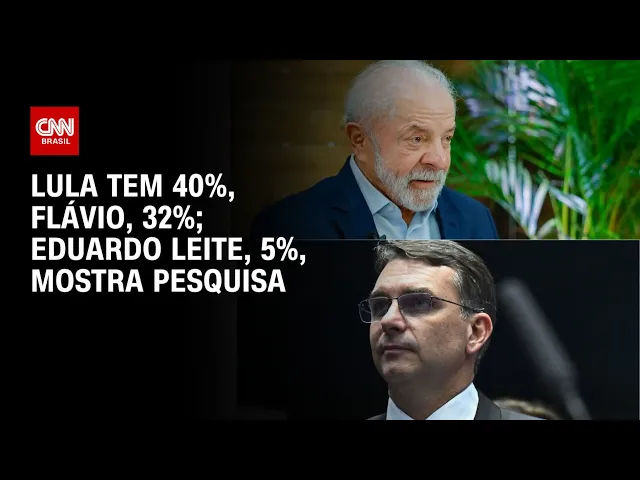 até um pouquinho mais alto ou antes tava com 40, agora me confundi, mas tá tava com 39 o anterior, então tecnicamente é o mesmo número, considerando a margem de erro. Flávio Bolsonaro aparece com 32%, mas o que é que eu quero chamar a atenção de vocês é o aparecimento nesta pesquisa, que é uma pesquisa estimulada, ou seja, você sabe quais são os candidatos. Eduardo Leite, nós vimos com Ratinho Júnior, o dado de Eduardo, de Ratinho Júnior era de 10%.