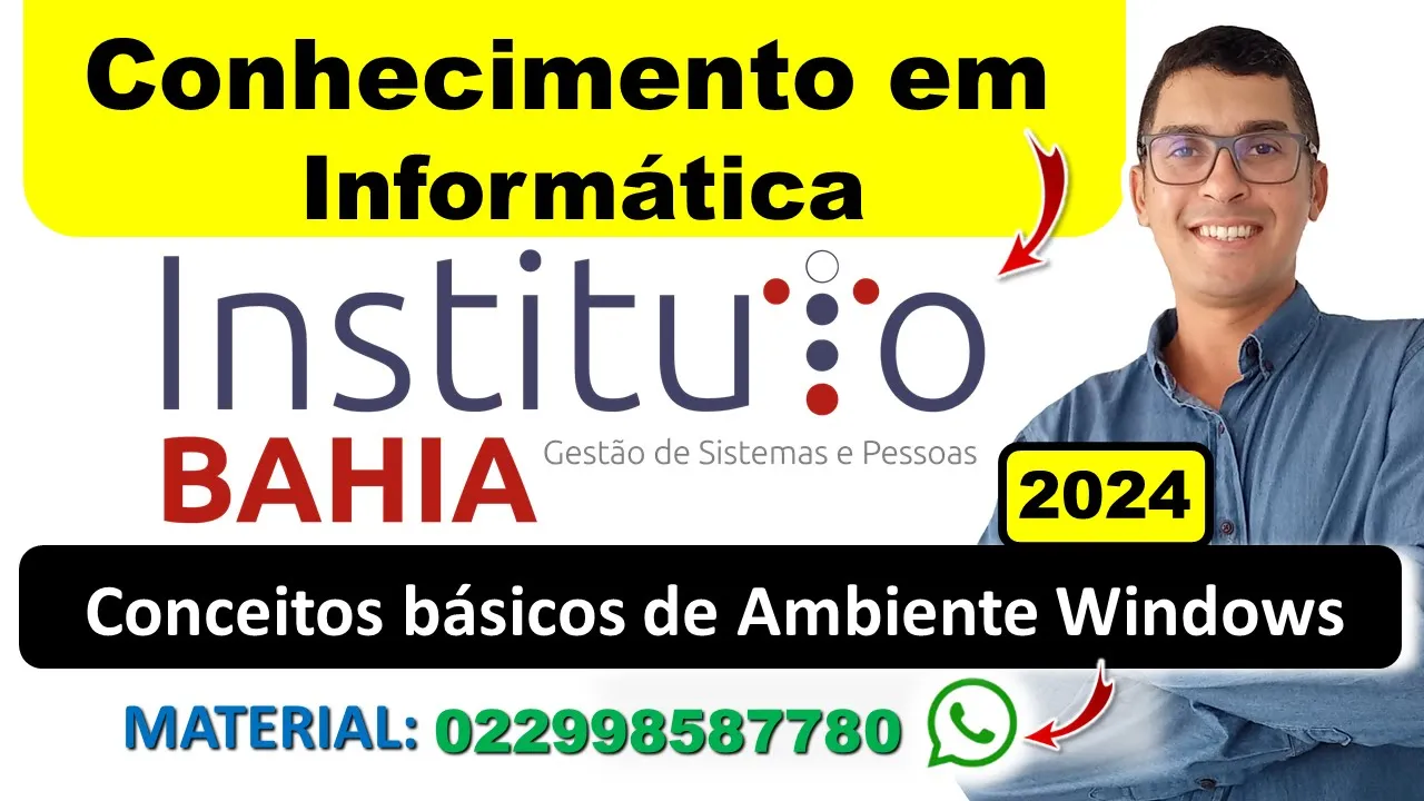Olá seja bem-vindo ao meu canal de informática para concursos públicos meu nome é romilton Júnior sou professor de informática para concurso e nesse vídeo eu vou dar uma aula gratuita de conhecimento informática com foco na banca Instituto Bahia a banca Instituto Bahia ela não disponibiliza suas provas anteriores então eu não tenho questões aqui para resolver do Instituto Bahia mas vou resolver de outras bancas falando sobre conceito básico de de ambiente Windows e eu tenho um curso de informática para concurso que você pode adquirir entrando em contato comigo pelo WhatsApp pelo telefone DDD 22 99858 7780