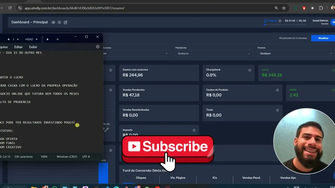 000 que eu tenho que rodar em anúncio Então vou precisar de terem caixa 90. 000 para eu poder rodar escalado desse jeito e é muito dinheiro 90. 000 para rodar escalado sem que o produto tenha já gerado caixa para Essa é a questão eu poderia tirar de outros negócios meu eu tenho para rodar Mas isso seria muito imprudente você precisa ser Prudente dentro da internet tá precisa arriscar mas também ser Prudente aqui por exemplo eu não vou tirar de outros negócios meu para botar aqui então eu tô fazendo de uma forma mais prudente esperando o negócio dar lucro é uma operação relativamente nova ela não girou tanto ainda então eu tô esperando ela dar mais giro para poder com o dinheiro da própria operação fazer o meu aa com o lucro que vai gerando nesse primeiro mês para aí sim pegar a grana e voltar e é isso que eu recomendo para você tá sem grana vai rodando na maciota Olha só eu tenho grana para meter aqui só que olha só tô rodando baixo agora é 10:30 da manhã e aqui olha só r26 em anúncio gastei só isso e olha só mesmo que eu gastei pouco Olha o lucro quase R 400 tava R 400 aqui quando eu acordei tá com até menos investido eu tinha investido R 190 tinha feito já 400 de lucro se você me segue lá no Instagram Você viu se não segue ainda me segue aí @f tá então eu tinha gastado 190 para fazer 400 de lucro gastou mais aqui né uns r$ 3 30 e pouco não fiz outra venda por isso que diminuiu aqui o lucro mas eh eu já acordo com o celular assim olha só olha só não sei se vai dar para ver ó ó vendas vendas 12 dólar vendas vendas e vendas todo dia Ó eu já acordo com com o celular assim vende muito bem durante a noite durante a madrugada então eu já acordo sempre com lucro bom E caso a pessoa não queira escalar eu poderia simplesmente acordar e desativar as campanha ficar de boa né Afinal 400 de lucro por dia ó vezes 30 eu tiro 12.