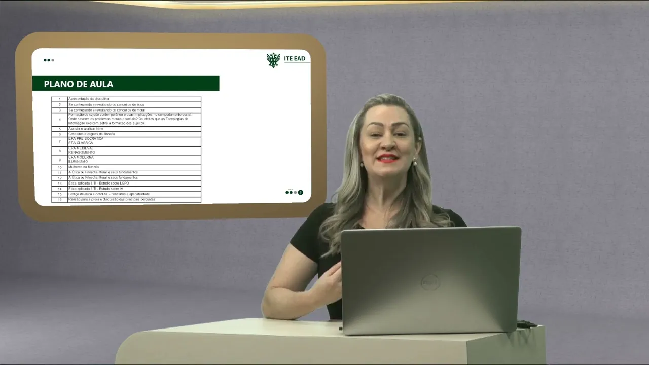 sobre os seus fundamentos aplicados também à tecnologia da informação e no contexto profissional e empresarial bom para isso nós estruturamos então as 16 aulas baseadas então em algumas práticas em algumas atividades mais ã objetivas e também algumas reflexões então ao longo dessas 16 aulas nós vamos falar alguns conceitos de ética alguns conceitos de moral vamos resgatar alguns conceitos filosóficos também vamos falar né fazer alguns testes fazer análise de alguns filmes justamente por quando nós tratamos da ética nós não falamos só de um conceito pessoal né mas nós temos que discutir Como isso acontece a da