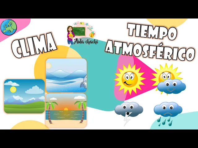[Música] hola chicos bienvenidos a un nuevo vídeo de aula chachi hoy vamos a aprender a diferenciar entre clima y tiempo atmosférico qué tiempo hace hoy en vuestra localidad y qué clima hace en verano ojos y orejas bien abiertos que vamos a aprender un montón de cosas hoy muchas veces hablamos de tiempo y clima como si fuera lo mismo pero no lo es tienen un significado diferente los procesos naturales que tienen lugar en la atmósfera como la lluvia la nieve o la niebla se conocen como fenómenos atmosféricos por eso se le llama tiempo atmosférico al estado
