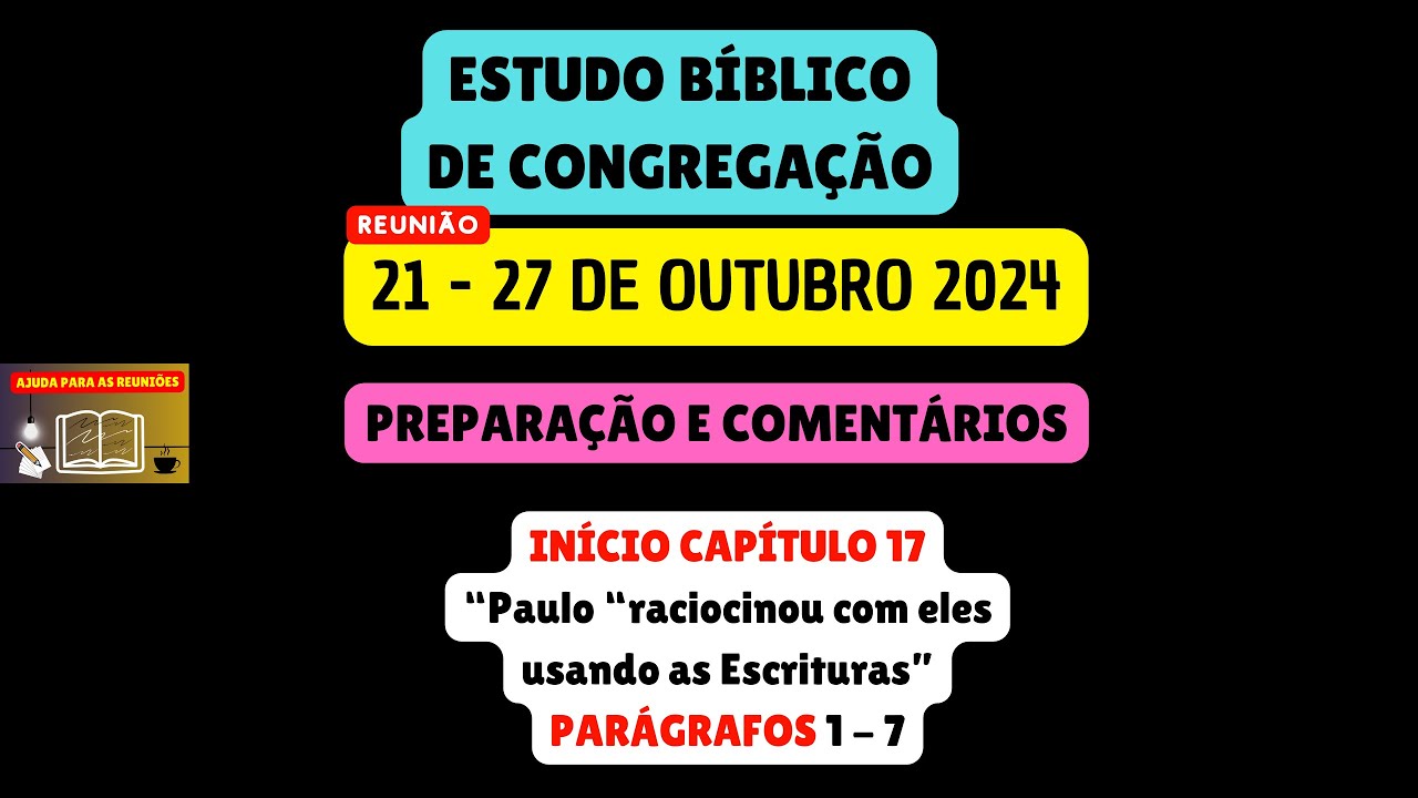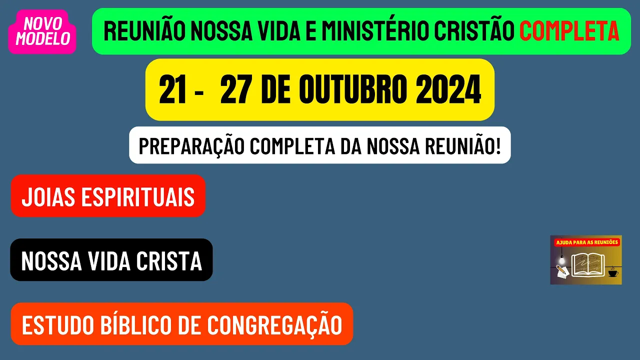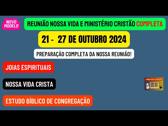 sejam todos muito bem-vindos ao nosso canal ajuda para as reuniões Esperamos que todos vocês queridos irmãos estejam bem Neste vídeo vamos estar disponibilizando a reunião nossa vida e Ministério Cristão completa desta semana 21 a 27 de outubro vamos de maneira objetiva analisar e preparar as partes principais desta reunião que são aquelas onde podemos dar nossos valiosos comentários iniciando vamos preparar as joias espirituais que podemos encontrar na leitura dos Salmos 100 a 102 Lembrando que esse texto é a base de toda a reunião passando para a sessão nossa vida cristã nós teremos um discurso muito encorajador