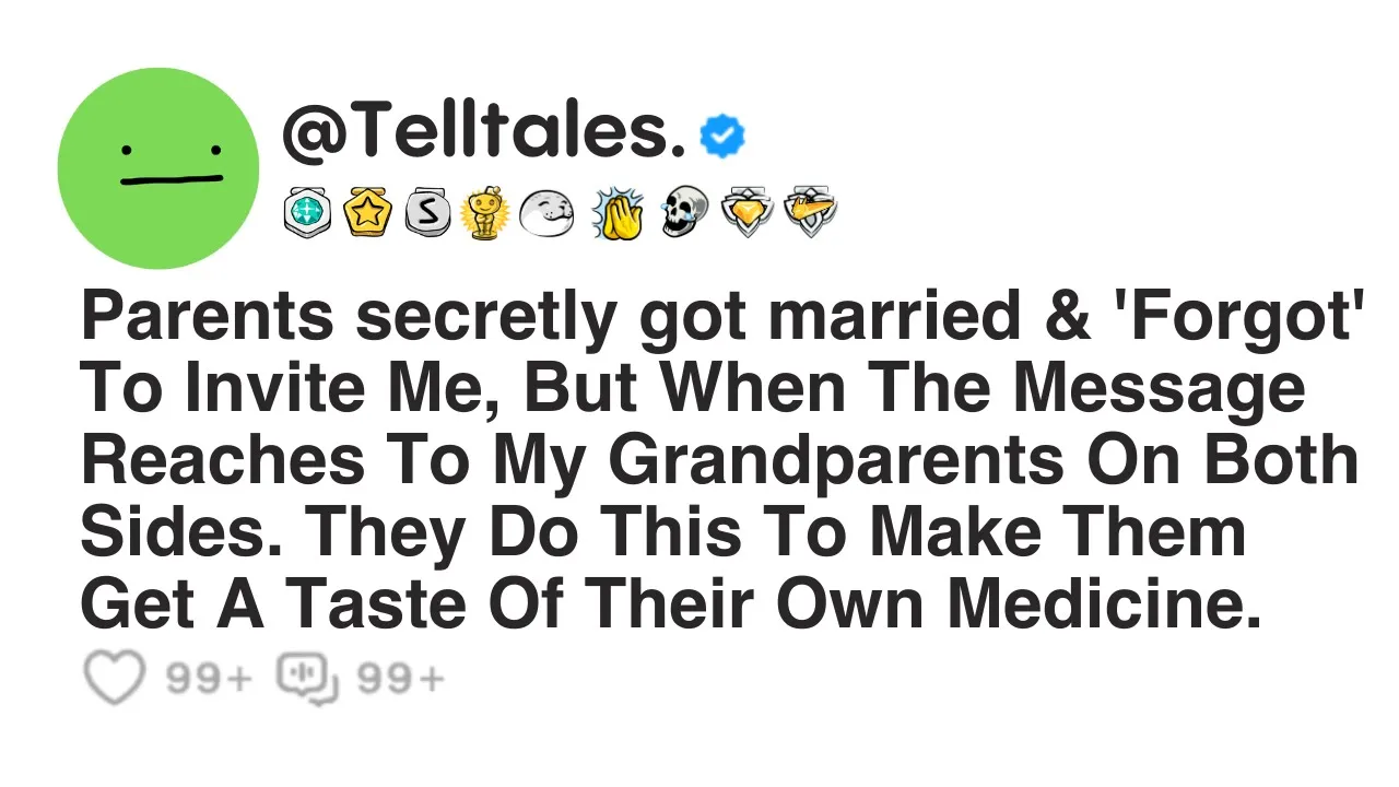 Parents secretly got married and forgot to invite me, but when the message reached my grandparents on both sides, they did this to make them get a taste of their own medicine. So both my parents got married to their respective partners last month, and somehow both of them forgot to invite me. I'm a 26-year-old male and live out of state for work, so I had no idea that they were even getting married.