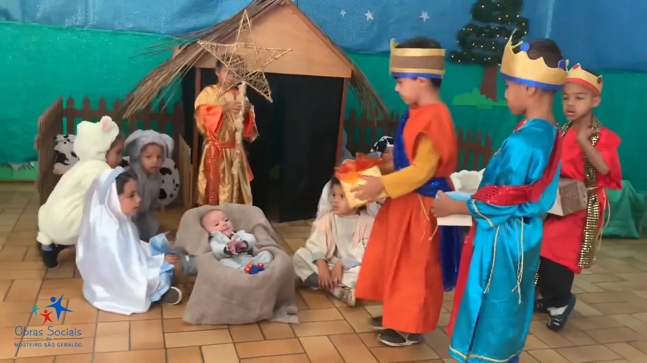 luar chegaram no local onde a estrela iluminava um velho galpão que servia de abrigo para os animais [Música] a entrarem no galpão vira um menino recém-nascido com poucos dias de vida e a Estrela Guia lançava sua luz sobre este menino tão simpático que parecia que ativar a todos ao seu redor e os Três Sábios logo reconheceram que aquele menino era especial pois até mesmo os animais que ali viviam pareciam ficar tranquilo e amorosos só por estarem próximos do menino e os sábios ofereceram três presentes ao menino entregaram a sua mãe e seu pai era o
