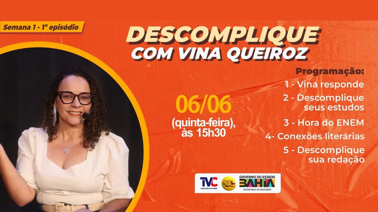 [Música] descomplique seu texto bhe no papel convina querois atinja o troféu na TV conexões sempre aprender com a caneta na mão pronto para vencer com sete passos sem complicação melhore sua nota sinta evolução v7p um método sensacional redação de peso resultado sem igual TV conexões apresenta descomplique sua relação comigo Vina Queiroz oferecimento Governo do Estado de Bahia Secretaria da Educação do Estado da Bahia Minha gente é um prazer estar aqui e hoje esse programa está muito especial foi preparado pensado para você que é estudante da rede estadual da Bahia exclusivamente para você a secretaria de