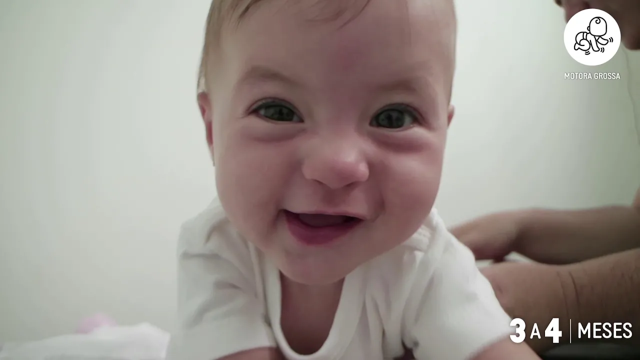 de distância da orelha não na frente para que a criança veja e sim ao lado e fazer um som deve e você vai observar a reação e geralmente a reação nesse momento é de piscadas a criança colocada de bruços ela não vai suspender o corpo todo mas ela vai conseguir elevar a cabeça de forma que ela em algum momento Mantenha o rosto inclusive o queixo afastada da superfície em diante de um estímulo ela já esboçou um sorriso e esse estímulo é só Ao estilo do outro aqui é um sorriso reativo alguma ao rosto o avós