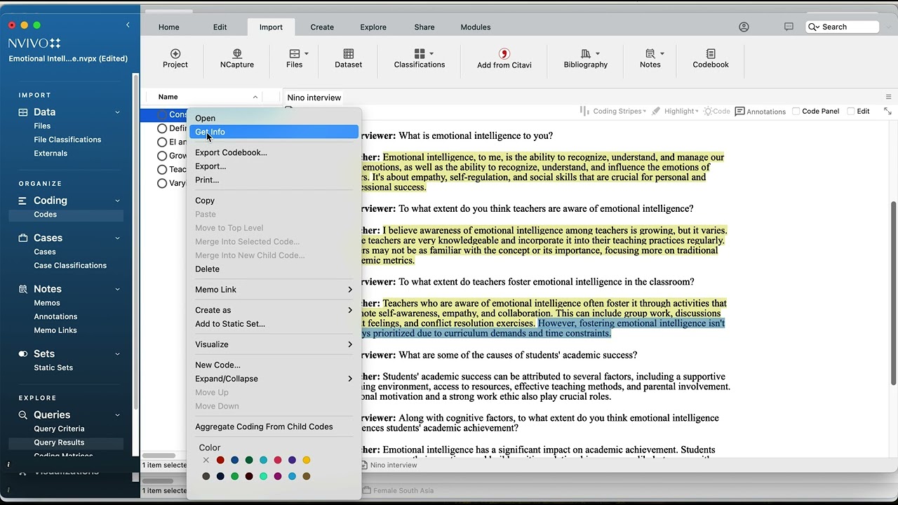 I've begun the coding process and number different ways you can go about this what idea was I just highlighted a section and up here at the top is a little command that can give it a give that section of color and I began to start coding this document you chunk it you take a little section and you read it and highlight it if it expresses some idea or thoughts or a concept and then you give that a name that will indicate to you what that that particular section is all about now we said there's number