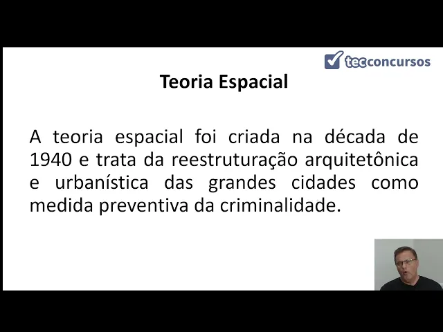 o controle social informal e tudo isso leva à criação de um meio né organizado de um meio né criminógeno e acaba levando aí para a prática do delito isso é teoria ecológica Tá bom mas Aí surge a teoria espacial Aí surge a teoria espacial teoria espacial foi criada na década de 40 né e a teoria espacial na verdade ela trata de uma estruturação arquitetônica e urbanística das grandes cidades como uma medida preventiva da criminalidade né na verdade a teoria espacial ela fala da chamada prevenção situacional do crime ou seja é você criar espaços defensáveis que