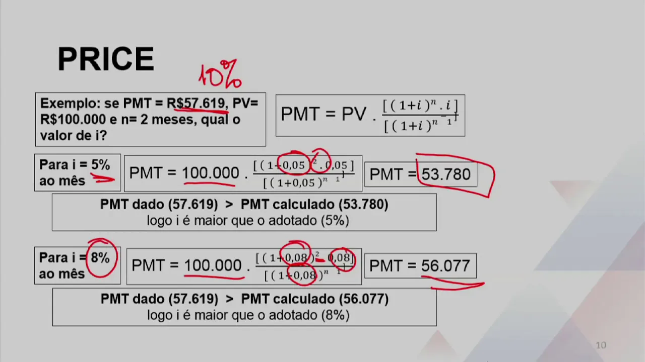 presente 100 mil em um período de dois meses para amortização qual é essa nossa taxa de juros vejam este é um exemplo exatamente da tabela anterior tha só pra gente ver não vou lá não sei quanto é vou admitir que a taxa de juro ao mês é 5% e aí vou fazer o cálculo 100 mil 5% o período os meses olha lá cheguei numa prestação de 53 mil setecentos e oitenta 53 mil setecentos e oitenta com relação aos 57 619 é menor a pmt dado 57 609 é maior do que o calculado aqui logo o