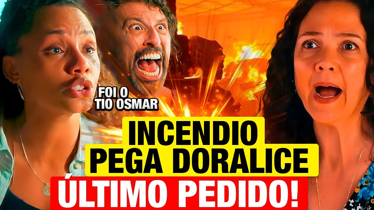 tá lá eu tenho que fazer alguma coisa para salvar a minha mãe Jão pede fique aqui Madá eu vou correndo lá salvar a Doralice me espera que já volto Jão entra no meio da fumaça para salvar Doralice Mica mais apreensiva ainda corre atrás do namorado e fala mãe mãe mãe Madá encontra sua mãe com os olhos fechados Jão usa toda a força que tem para tirar Doralice de lá mas fica fraco e começa a tosir Madá não consegue acordar Doralice e fala mais alto abre o olho Mãe fala comigo por favor mãe fala comigo Jão