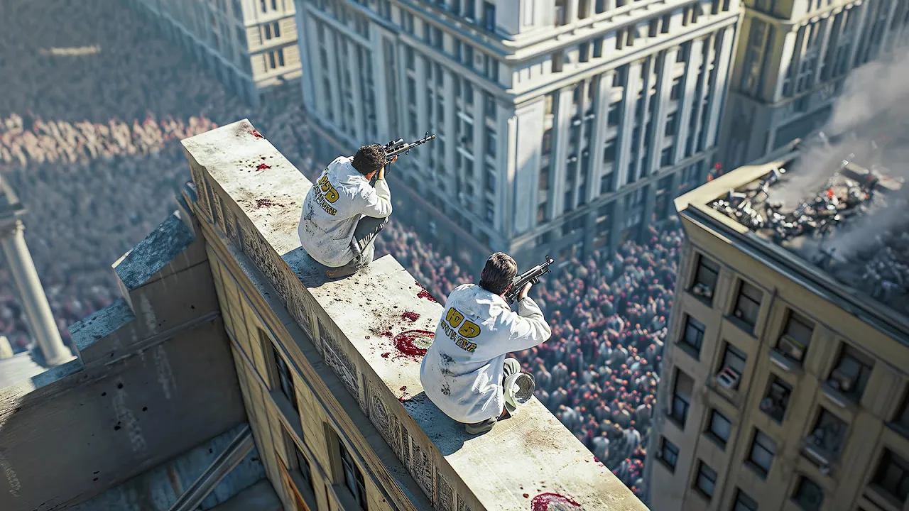 The guards go downstairs and find the twitching zombie in the fountain. He used to be a guard too, but now his friends have no choice but to shoot him in the head. Then they go around the other stores and shoot every zombie they find.
