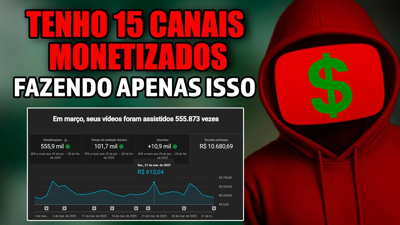 Eu já tenho vários outros canais, se você não sabe, eu já monetizei mais de 10 canais, canais darks aqui no YouTube, onde eu não preciso aparecer e nem utilizar minha voz. Então, eu já tenho vários outros projetos rodando, me gerando renda e por isso eu não consigo focar 100% nesse canal, mas muito em breve esse canal vai estar monetizado. Ele já está aqui com quase 3.