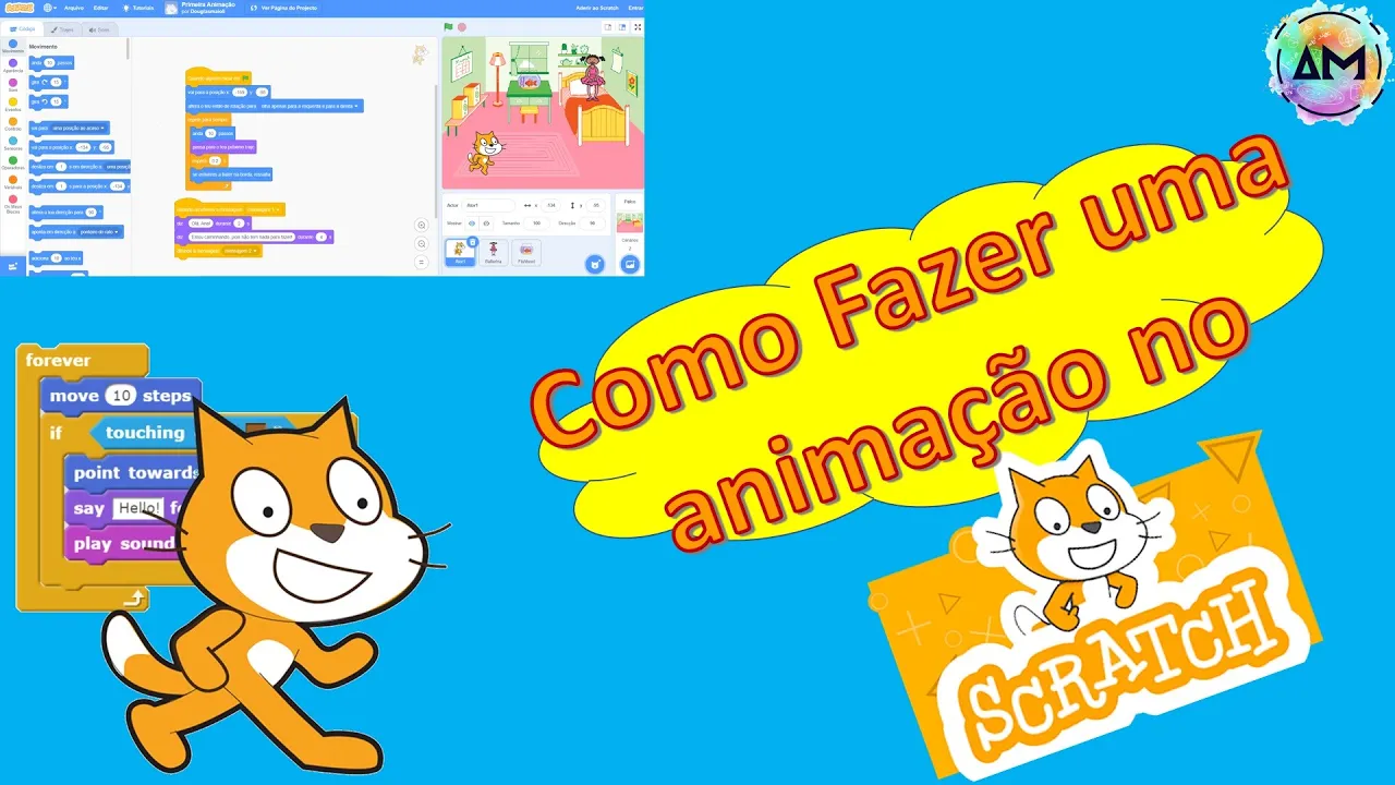 o olá pessoal que o professor douglas falando hoje vamos aprender a mexer um pouquinho no scratch bicyclette é um programa na tem uma plataforma da aprender e eu te passo de prender programação então a gente vai a gente vai fazer uma animação no scratch o bom é que se você for seguindo os passos que eu vou fazendo você vai fazendo junto e depois você conseguir rodar minha a animação você fazer a sua do jeito que você quiser que a fala que você quiser com os programas que você quiserem aí usar aquele criatividade e vamos começar não precisa falar nada dá para você usar os clientes online só concentra na plataforma do skate que é isso crash. net ponto e do snt universidade criou sweet carol m ait universidade americana vamos entrar em sicredi. net ponto vou deixar o link aqui embaixo clica em criar quando você clicar em criar vai abrir o editor do esporte então aqui no editor do sicredi primeira coisa se você entrar eu termino besta provavelmente vai estar em inglês tudo e as palavras aqui no editor também aqui nesse mundo aqui em cima você vai ver que tem várias línguas coloca português brasileiro grato não colocar português que você nasceu português de portugal vai ficar um pouco estranho para você me mandar algumas palavras coloca português brasileiro e agora vamos ver cada uma dessas partes significa estão primeiro tudo que a gente for programar vai ser executado nessa parte aqui onde está o gato aqui ó só parte branca aqui aqui a gente pode colocar a gente pode colocar o palco e é o fundo e os atores são os personagens que nós vamos ter que o palco por enquanto está em branco que a gente pode fazer aqui do ladinho embaixo e canto inferior direito tá em qual lá tem um botão que é selecionar cenário tem vários cenários que você pode ser ensinado se você quiser fazer desenhar o cenário algum programa também dá para usar aqui como o seu celular esqueci a sua cenário art floc eu tô aqui eu vou colocar esse cenário aqui nesse quarto aqui os atores estão por enquanto só tem o ator gato aqui e essa parte aqui é dos atores então esse gato se chama turma um tem o tamanho do lugar se eu quiser mudar as dimensões do gato eu posso mudar as dimensões do gato deixa maior menor a direção aqui que ele tá olhando também ó eu posso deixar ele olhando o lado que eu quiser vou deixar olhando para frente 90 é a posição dele a posição dele como que a gente tem imagina que aqui tem um eixo cartesiano x y e x oculta que não é bem no meio que tem isso bem no meio que tem um x então aqui seria 100 no começo meio se a gente colocar em outra posição ele vai ter um valor de x e o valor de isso no caso aqui ó xista menos 162 y - 99 militar se você quiser colocar os fatores é só clicar aqui ó selecionar o ator vai aparecer vários atores aqui há vários personagens vão colocar o que eu vou colocar essa bailarina colocar lá em cima aqui da cama e se quiser colocar mais atores pode colocar também é um colocar outro animal porque esse peixe deixa eu vou deixar aqui em cima da mesinha e esses atores eles vão interagir entre eles e com o usuário também ok aqui essa parte aqui do meio é onde vai estar nosso código então vai ter um código para cada dor né daqui é o código para o peixe se a gente ficava lendo aqui o código da bailarina se a gente fica no gato o código do gato né ele tá aqui ator um colocar aqui ó o nome dele é cá agora a gente chama gato é bem aqui onde eu vou colocar o programa né algoritmos do que o gato vai fazer eu vou pegar opções daqui ó aqui que a gente vai selecionar então tem ferramentas azul esqueçam de movimento mover girar e para uma posição fixa afundar para uma direção tem aqui ó se tocar na borda volte a gente vai ver isso como funciona estilo de rotação aparência é para falar alguma coisa para mudar o tamanho para mudar fantasia daqui a pouquinho da viu que a fantasia são evento geralmente inventa quando a gente vai começar dar uns como que a gente vai dar o start para ele falar alguma coisa para ele fazer alguma coisa né então tem alguns eventos que pode acontecer o controle de um repita teu espere tem os e você não espere até que o sensor tem alguma coisa que você a quando tocar no mar a tocar na borda quando tocar no outro né porque os operadores aqui que é só uma menos vezes divisão que os verdes e tem as variáveis a gente vai trabalhar com variável laranja e esse meu blocos é quando a fazer alguma função que a gente vai fazer aqui depois a gente pode ver melhor eles estão cada tipo tem uma cor vai ficar colorido o nosso código aqui na fantasia são posições diferentes que nós atores têm então por exemplo eu tenho ele aqui com a perna esticada e o próximo kapern corrida por aqui se eu for trocando a fantasia ele vai simular uma corrida o caminhada se eu vim aqui na bailarina clique aqui não vai lá ainda e a casa fantasia ella tá simulando que tá dançando então cada a turma ter uma certa fantasias para simular alguma coisa ok vamos para o gato e vamos começar o nosso código nosso colhe o primeiro a gente tem que dar um evento para começar eu vou colocar aqui ó pode ser quando clicar nele quando clicar no botão verde na bandeira verde eu vou colocar aqui ó quando a bandeira verde foi clicada que que venha fazer eu vou colocar para ele mover então vou lá no movimento o controle tá aqui no lar angu o quando tá aqui no amarelo o que é o evento e eu vou lá no azul para fazer um movimento colocar mova dez passos tão só clicar na bandeira verde ó cliquei cliquei cliquei cliquei que tá acontecendo ele tá movendo dez passos à se eu quiser aumentar mais passo colocar 50 por aqui ó eu até te vendo um pouquinho mas sabe que ele anda mais né cada vez que eu clico e vamos deixar dá espaço aí se eu quiser que liam de bastante ah então beleza já para a gente brincar no controle laranja tenho e pizza com a repita 10 vezes el