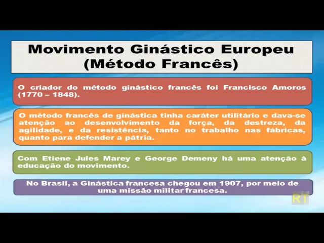 Olá pessoal começamos mais uma aula sobre o movimento ginástico europeu na vídeo aula passada falei sobre o método ginástico Sueco e na vídeo aula de hoje falarei sobre o método ginástico francês bem pessoal a ginástica francesa o método ginástico francês emergiu na primeira metade do século XIX ela estava alicerçada nos ideais de Jean e good e também por ideais patrioticos e Morais com intuito de atingir tantos militares quanto a população pois se defendia uma educação para formar um homem completo e Universal incluindo o exercício físico bem pessoal podemos ver aqui no quadro vermelho é que