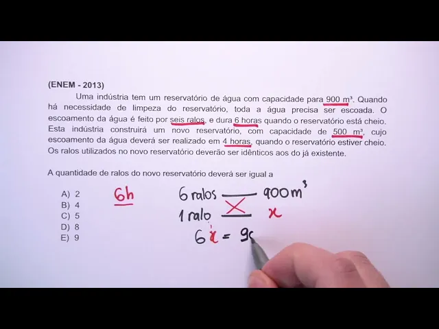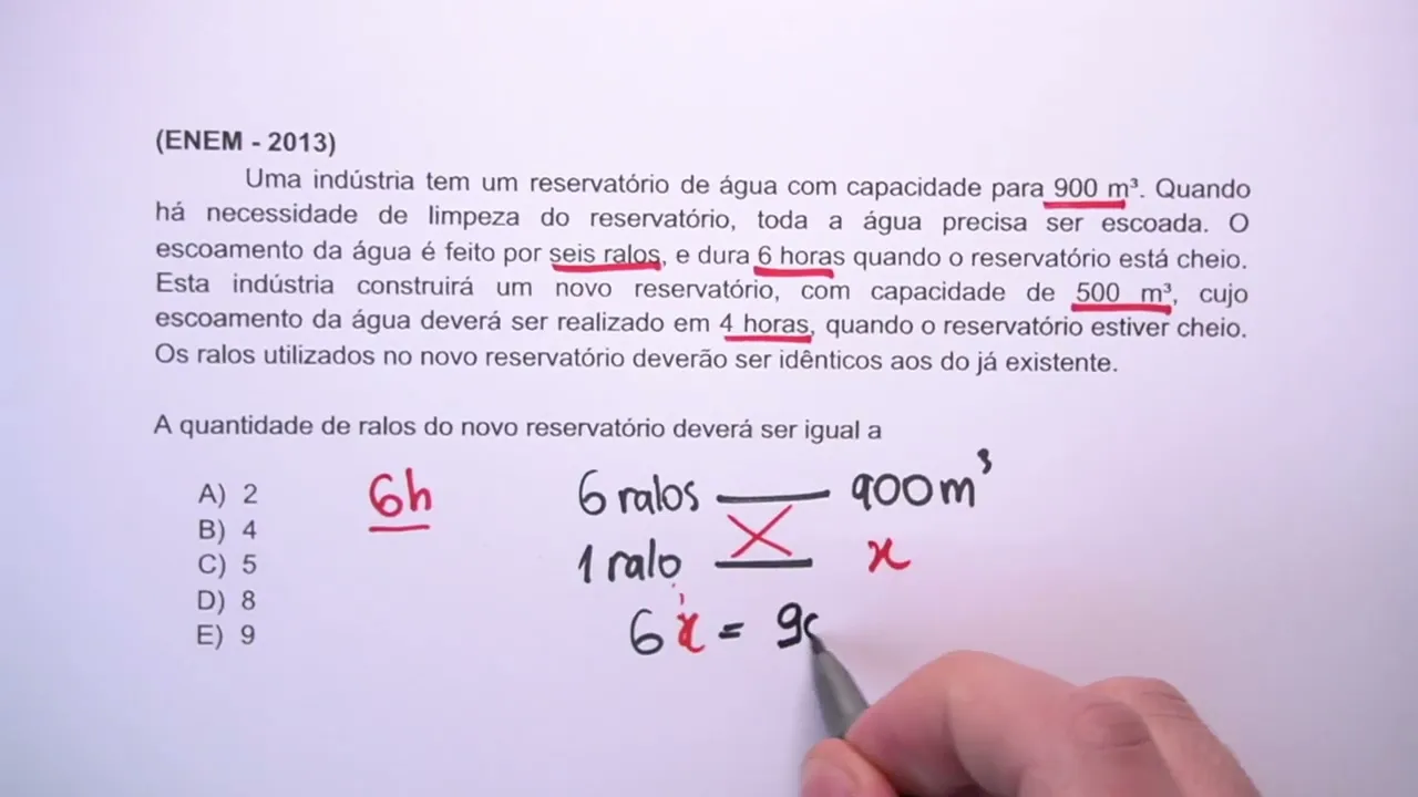 vamos lá galera do me salva Enem 2013 uma questãozinha que a gente vai resolver juntos uma indústria tem um reservatório de água com capacidade para 900 m c quando há necessidade de limpeza do reservatório toda a água precisa ser escoada o escoamento da água é feito por seis ralos e dura 6 horas quando o reservatório está cheio esta indústria construirá um um novo reservatório com capacidade de 500 m c cujo escoamento da água deverá ser realizado em 4 horas quando o reservatório estiver cheio os ralos utilizados no novo reservatório deverão ser idênticos aos do já