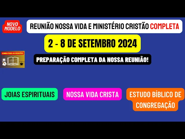 sejam todos muito bem-vindos ao nosso canal ajuda para as reuniões Esperamos que todos vocês queridos irmãos estejam bem com as bênçãos de Jeová e neste vídeo estaremos disponibilizando a reunião nossa vida e Ministério Cristão completa desta semana 2 a 8 de Setembro como sempre de maneira objetiva vamos analisar e preparar as partes principais desta reunião que são elas por perguntas e respostas onde podemos dar nossos valiosos frutos de lábios nossos comentários iniciando vamos preparar as joias espirituais que podemos encontrar na leitura dos Salmos 79 a 81 passando para a sessão nossa vida cristã nós vamos