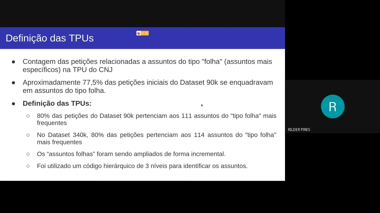 ao aos dados né No No início do projeto uma tabela chamada assuntos né que veio junto no início do projeto que a gente recebeu e que lá tinha essa mais ou menos essa estrutura dizendo Quem era o pai de cada assunto né e a partir daí a gente construiu a TPU Eh vamos dizer assim que é utilizada pelo CNJ pelo sistema mesmo né então qual foi o processo pra gente construir na verdade né definir os assuntos que a gente utilizar pro classificador né porque no fundo o que a gente quer é classificar em um desses