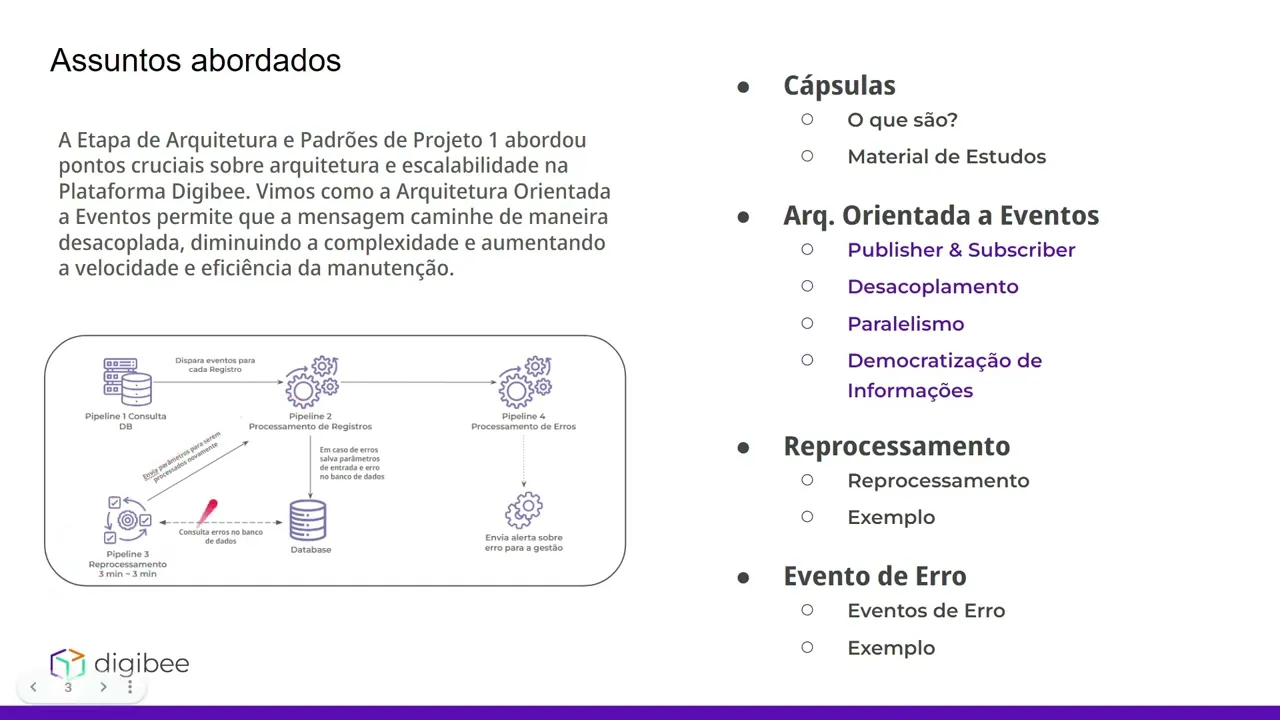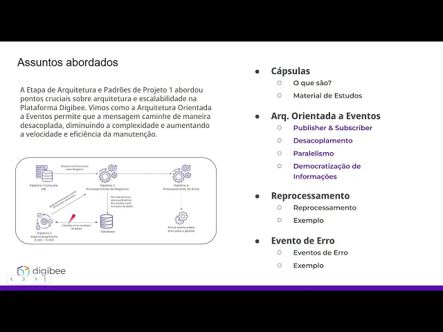 Olá esse é o integration developer Boot Camp estamos na etapa de arquitetura e padrões de projeto um nesse vídeo faremos a finalização dessa etapa a etapa de arquitetura e padrão de projeto 1 abordou pontos cruciais sobre arquitetura e escalabilidade na plataforma Debi vemos como a arquitetura oriental de eventos permite que a mensagem encaminhe de maneira desacoplada diminuindo a complexidade e aumentando a velocidade e eficiência de manutenção à direita tem os assuntos que foram abordados nesse módulo vimos o que são cápsulas como utilizá-las e para que elas servem focamos bastante no momento de arquitetura orientada eventos