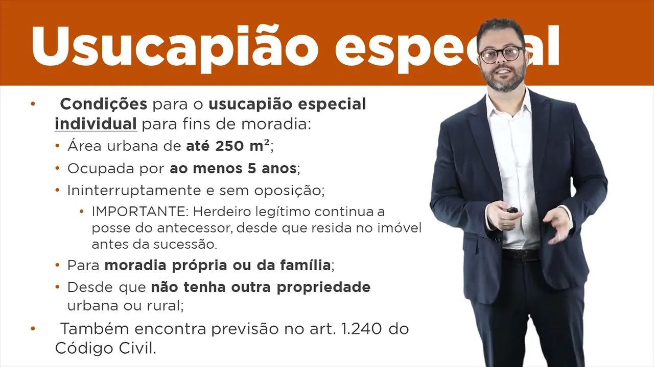 coletiva na usucapião especial individual para fins de moradia é preciso que nós respeitemos os seguintes requisitos em primeiro lugar que que a área urbana ocupada não tenha mais de 250 m qu tá certo é preciso também que a ocupação ocorra por no mínimo 5 anos de maneira ininterrupta e sem oposição aqui uma observação o herdeiro legítimo pode continuar a posse do antecessor desde que ele resida no imóvel antes da sucessão ademais nós precisamos levar em conta que aquela propriedade ocupada tem que ser utilizada para moradia própria ou da família nós estamos falando aqui da usucapião