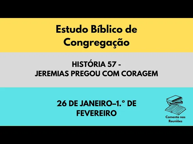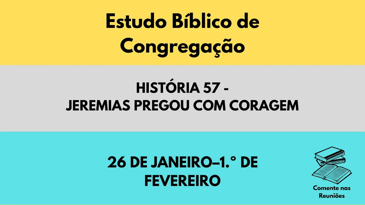 Olá, irmãos e irmãs. Bem-vindos ao canal Comente nas reuniões. Hoje vamos compartilhar sugestões de resposta na sessão do estudo bíblico de congregação da semana do dia 26 de janeiro a 1o de fevereiro com o tema história 57.