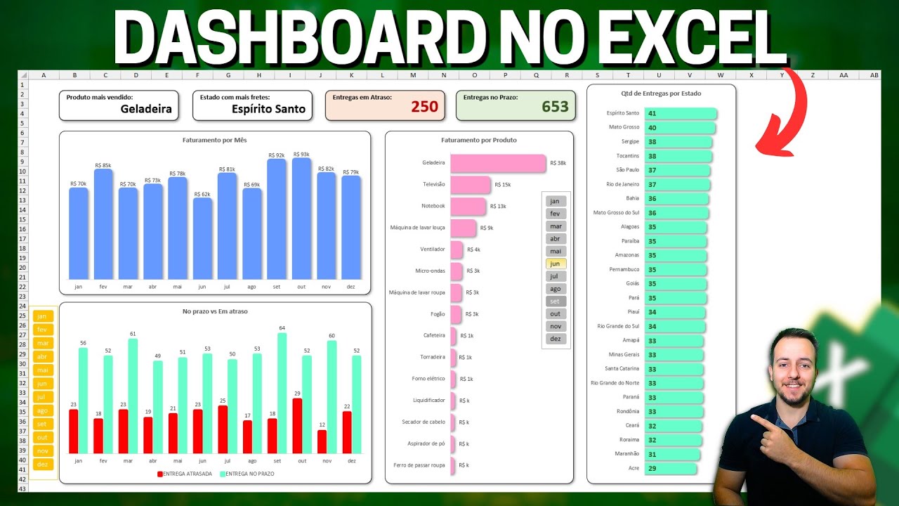 um top 10 destes produtos organizado do maior ma pro menor a quantidade vendida por mês nesse gráfico moderno de linhas e aqui nesse gráfico de áreas o faturamento por mês e todos os gráficos atualizam automaticamente à medida que eu troco a opção nessa minha listinha das regiões então passo a passo do zero V aprender a fazer esse dashboard bonitão aqui no Excel de modo simples fácil e rápido vamos lá a primeira coisa que a gente precisa ter no Excel para fazer qualquer tipo de dashboard é uma base de dados ou seja as informações que a