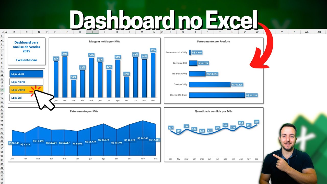 em menos de 15 minutos a gente vai aprender como fazer esse dashboard bonitão moderno e interativo aqui no Excel utilizando uma tabela como base de dados tabelas dinâmicas no Excel que vai nos ajudar muito a fazer as análises que a gente precisa e por fim a gente faz aqui esse dashboard totalmente interativo e dinâmico ainda com essa listinha de opções onde você pode filtrar por região e dessa forma atualizar todo o dashboard que você tem existem infinitos tipos de análises que a gente pode fazer Porém Aqui a gente vai ver margem média produto mais vendido