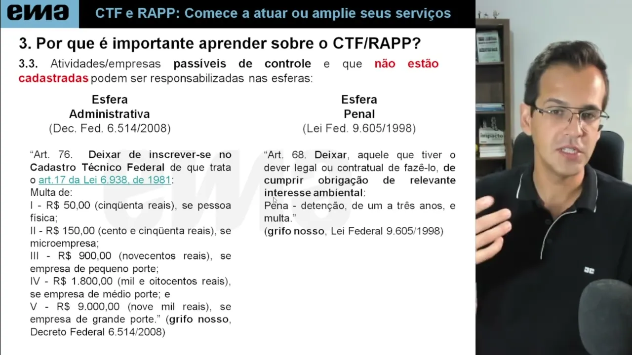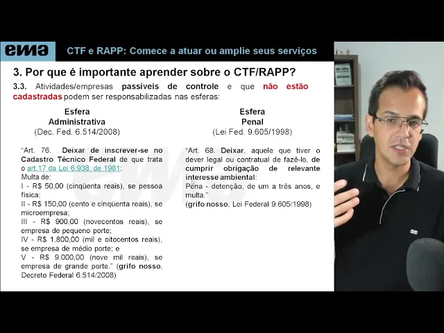 prática como é que é o curso Wagner como é que é esse curso que você tá falando do CTF Rapp na prática esse curso Ele tá dividido da seguinte forma primeiro mdulo um é a base legal de toda essa questão do CTF do r app e o módulo dois o que que precisa ser inscrito no CTF Como que eu faço passo a passo inclusive com vídeos tutoriais com a tela do computador para você ir clicando e fazendo junto no módulo três a gente fala da taxa de controle e fiscalização ambiental e falamos do Rapp das