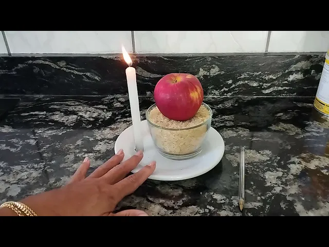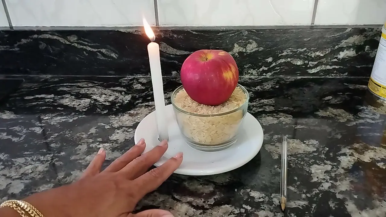 eu escolhi aqui no meio né em cima do Arroz aqui é um prato que eu coloco só para apoio tá e vou pegar a velinha Branca se quiser colocar um incenso também pode colocar enfim com incenso no arroz tá Ou coloca ele Na fruta Acenda a velinha faça uma oração de minha devoção pode ser um pai nosso pode ser um pai nosso um Ave Maria né uma santa maria o Pai Nosso completo E aí você vai fazer os seus pedidos tá eu peço ao ao universo aos anjos da abundância da Prosperidade que abra meus caminhos