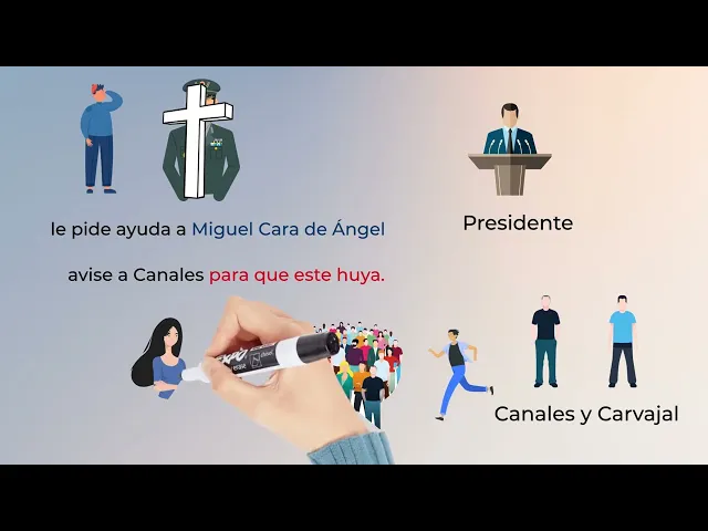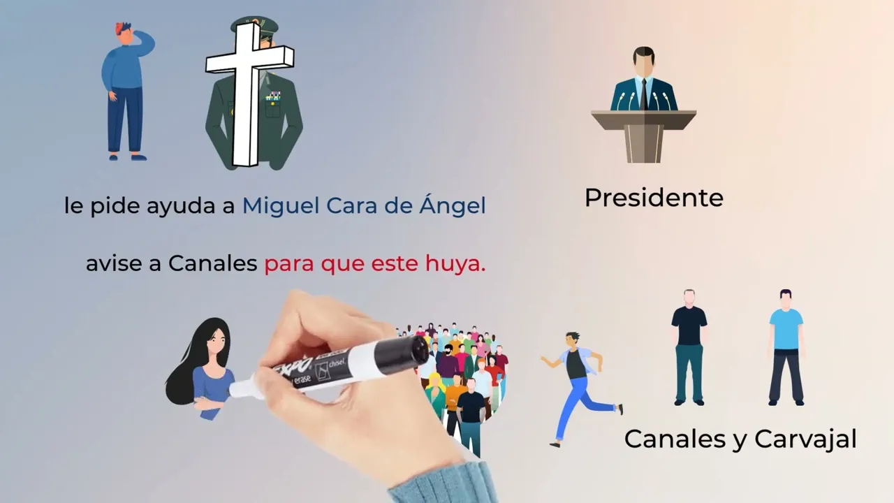 dos hombres que parecían estar organizando la oposición a la Dictadura ambos son acusados pero el presidente quiere que uno de ellos canales huya antes de ser detenido no quiere ejecutarlos a los dos por la imagen que eso podría dar además cree que la huida será vista por el pueblo como una confesión para organizar esta huida le pide ayuda a Miguel Cara de ángel uno de sus ayudantes más fieles y preferidos el plan es que Miguel Cara de ángel avise a canales para que este huya cuando empieza a preparar el plan Miguel Cara de ángel se