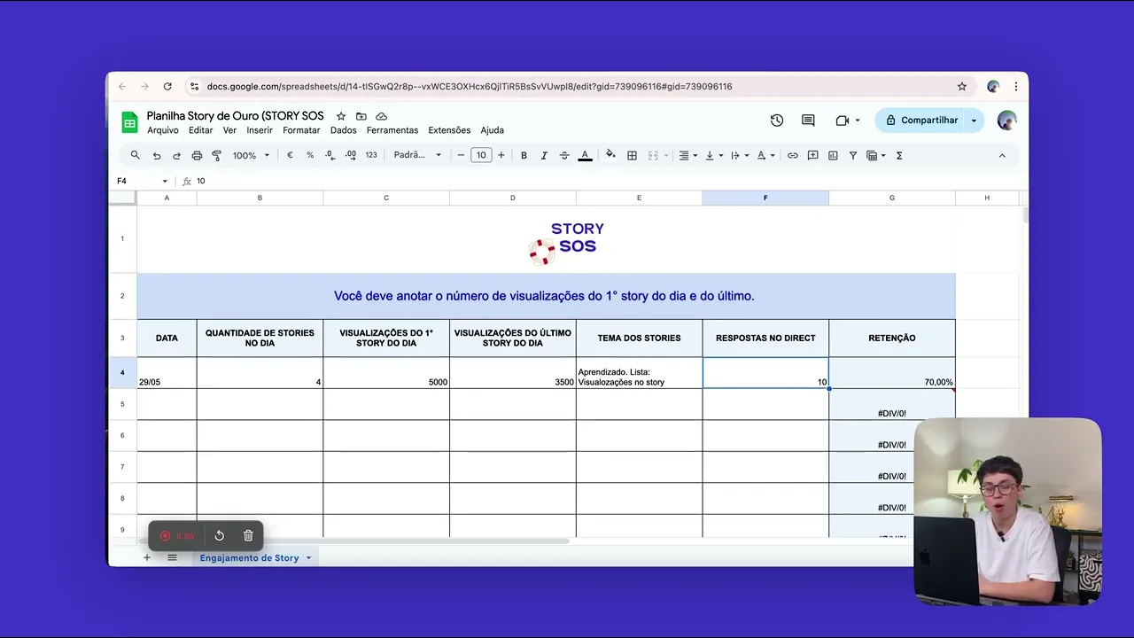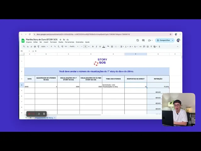 as minhas retenções aplicando stor SOS vai ser legal saber e aqui ó tu não precisa alterar nada não tá já vem aqui calculado só vai preenchendo que a planilha já calcula para ti aqui quantidade de retenção E tu vai anotar a quantidade de respostas no Direct é uma planilha simples mas que te ajuda muito a Identificar qual que é o teu Stories de ouro faz a cópia dessa planilha para ti e usa e abusa tá bom