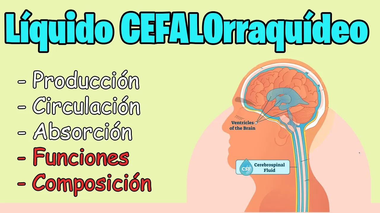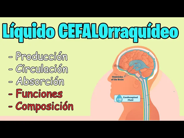 [Música] Hola compañeros bienvenidos al Canal en esta ocasión estaremos hablando acerca del líquido cefalorraquídeo en el presente vídeo estaré abarcando sus funciones su producción como circula también veremos su absorción y dónde y también estaré hablando acerca de su composición sus características y su utilidad clínica todo esto será bien explicado en un vídeo corto y sin más que decir iniciamos el líquido cefalorraquídeo es un fluido corporal estéril e incoloro que se encuentra en el espacio su paranoideo tanto en el cerebro como en la médula específicamente entre las meninges aquí la tenemos entre la aracnoides y la vía madre funciones del líquido cefalorraquídeo la función primaria de líquido cefalorraquídeo es Aparentemente mecánica ya que ese sirve como amortiguador de las fuerzas de aceleración y desaceleración Como sucede en las contusiones o golpes también este actúa como sistema linfático ya que dentro del sistema nervioso no hay conductos linfáticos y de este modo el líquido cefalorraquídeo sirve para eliminar los desechos del metabolismo cerebral especialmente dióxido de carbono lactato e hidrogeniones también el líquido aquí yo tiene una función de transportar ya que este constituye el vehículo para las sustancias neuromoduladoras involucradas en La regulación de funciones vitales quimiorreceptores hormonas de la neurohipófisis así como también del hipotálamo y la glándula pineal y teniendo en cuenta que el tejido ependimario la piel madre y laracnoides son avasculares el líquido cefalorraquídeo también juega un rol nutricional Ahora pasemos con la producción del líquido cefalorraquídeo lo primero a tener en cuenta es que su producción varía dependiendo de la edad y el género su producción diaria de líquidos cefalorraquídeo es de unos 500 mililitros a una velocidad media de unos 0. 35 mililitros por minutos en el adulto sano el volumen total oscila entre los 90 a 150 mililitros lo que significa que diariamente ese líquido se renueva completamente de 4 a 5 veces ahora en neonatos el volumen total oscila entre los 10 a 60 mililitros la producción de líquido cefalorraquídeos tiene dos orígenes flexual y extraplexual el origen presual básicamente se refiere a los presos coroideos de los 4 ventrículos cerebrales aquí los tenemos el primero y el segundo que conforman los ventrículos laterales luego le continúa el tercero y el cuarto ventrículo como vemos aquí esta red de plazos coroideos está situada en las paredes de los ventrículos cerebrales fundamentalmente en el primero y el segundo es decir en los ventrículos laterales y en conjunto tienen a cargo la producción aproximadamente del 70% del líquido cefalorraquídeo ahora con el origen extrapesual se refiere a la producción de líquido cefalorraquídeo que se lleva a cabo en el epitelio pendinario y esto se da a partir del líquido intersticial ese origen representa el 30% de la producción de este líquido ahora centrándonos en la producción principal del líquido cefalorraquídeo es decir en los presos coroideos vemos que estas Son estructuras formadas por un gran número de capilares que forman una red y éstas están rodeadas por células similares a las epiteliales pero que en conjunto no están soportadas por una lámina basal como vemos aquí Este es un epitelio cuboidal simple cubierto por microvellosidades en su zona apical que corresponde esta parte a la cara ventricular del epitelio es decir esta zona de aquí ahora en su cara basal como vemos aquí existen capilares endoteliales con uniones a través de esas uniones abiertas va a pasar por presión hidrostática un ultrafiltrado plasmático que posteriormente pasa hacia la zona apical de la célula aquí nuevamente en la zona apical por un proceso activo estará implicada la bomba sodio potasio adenosín trifosfato y la nihidrasa carbónica de la microvellosidades para secretar finalmente el líquido cefalorraquídeo hacia el espacio ventricular ese proceso de producción de líquidos cefalorraquídeo se lleva a cabo interés instancia primeramente el ultrafiltrado a partir de los capilares del peso corodio y la absorción de dicho Ultra filtrado por parte de las células del epitelio coroideo bien en segundo lugar tenemos la transformación dentro de las células del epitelio coroideo y ya En tercer lugar se refiere a la excreción dentro del sistema ventri bien Esto es cuanto a lo que se refiere producción de líquidos cefalorraquídeo ahora cuáles factores pueden reducir la producción tenemos varios por ejemplo algunos fármacos como los esteroides y los diuréticos también la hipotermia puede reducir la producción Asimismo una hipoperfusión cerebral y una hipertensión intracraneal bien Ahora pasemos con la circulación del líquido cefalorraquídeo tenemos que el líquido formado en los ventrículos laterales es decir primer y segundo ventrículo es el líquido va a pasar hacia el tercer ventrículo a través del foramen interventricular También conocido como agujeros de Monroe a partir de aquí del Tercer ventrículo el líquido va a llegar al cuarto ventrículo a través del Acueducto cerebral También conocido como Acueducto de Silvio también esto lo podremos en esta en esta imagen vemos muy bien aquí claramente el ventrículo lateral y el líquido producido a nivel de los ventrículos laterales como ya mencioné va a pasar hacia el tercer ventrículo a través de los agujeros de morro y de aquí va a llegar al cuarto ventrículo a través del Acueducto cerebral o Acueducto de Silvio lo mismo podemos apreciar en esta imagen vemos claramente los plazos coroideos a nivel del ventrículo lateral que luego va a pasar hacia el tercer ventrículo a través de los agujeros de morro y de aquí al cuarto ventrículo a través del Acueducto cerebral o Acueducto de Silvio bien luego de aquí el líquido cefalorraquídeo atraviesa los orificios de luzca y el de Maguey en esta