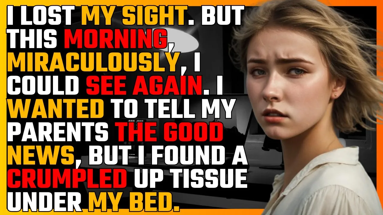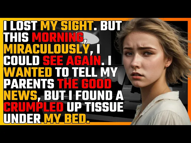 I lost my sight but this morning miraculously I could see again I wanted to tell my parents the good news but I found a crumpled up tissue under my bed there was a message on the tissue don't tell them you can see 3 months ago I lost my sight because of a car accident my parents moved us away from the city in order to take better care of me but this morning I miraculously regained my sight I was just about to tell my parents the good news when I suddenly noticed a crumpled up tissue under