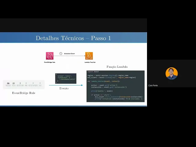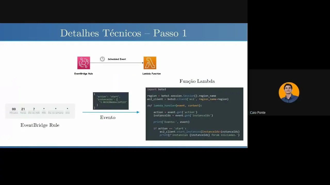detalhamento de cada um né então O Event brid é um escalonador de evento que vai e enviar um evento lá paraa função lambda né Então aqui tem um exemplo de uma regra né seja cada 21 horas de todo dia ele vai lançar este evento esse evento ele ele ele indica que eu quero iniciar dar um start nessa determinada Instância com esse ID né esse evento é como se fosse os parâmetros né Eu quero que ligue essa Instância né mas só que esses parâmetros vão para esse código aqui que é uma função âmb daa eh executar