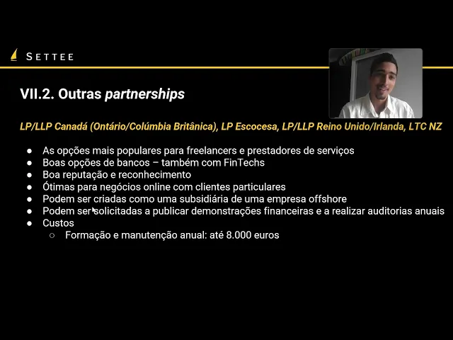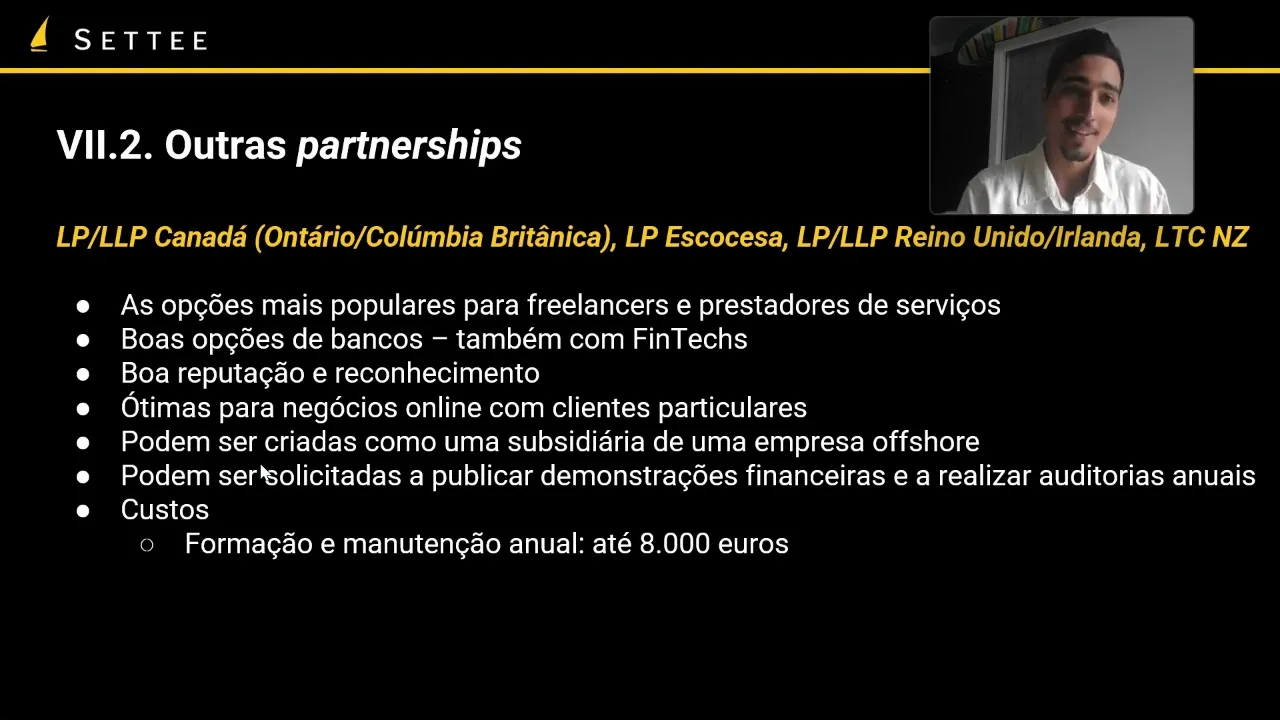britânica ele porém tem umas limitações ele é feito para profissões relacionadas a advogados contadores auditores etc foi um modelo feito para esses públicos então não usando ele para esses fins você utilizar essa empresa para outros negócios é você pode estar abdicando da responsabilidade limitada e pode também ter consequências fiscais Caso seja descoberto não é o que geralmente descobre facilmente mas algo a se mencionar na ele LP no Reino Unido você não tem esse problema ela pode ser utilizada para outros negócios também mas no Canadá é um dos motivos com a gente não abre muito no