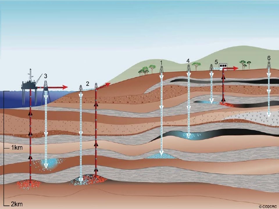 antes da queima do combustível mas esta técnica ainda está em desenvolvimento separado o co2 é comprimido e transportado por gasodutos navios ou petroleiros para instalações subterrâneas ou submarinas é injetado abaixo das camadas de gás rochas e armazenado sob pressão até atingir um estado quase líquido locais adequados de armazenamento incluem campos finais de petróleo e gás ou as camadas mais profundas de rocha porosa impregnada de água salgada