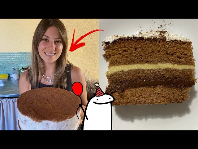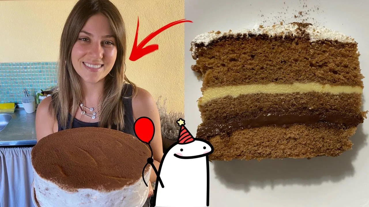 quanto na camada de cima que eu não mostrei PR vocês mas eu coloquei um pouquinho de leite vegetal misturado com achocolatado para deixar o bolo mais molhadinho Inclusive essa receita de pão de ló fica bem seca porque ela é feita só com Maizena então quanto mais você conseguir molhar esse bolo mais gostoso vai ficar depois de ter recheado o bolo com brigadeiro eu resolvi fazer mais uma camada fiz um creme de confeiteiro que eu vou deixar a receita aqui embaixo e fiz mais uma receita de pão de ló Eu também deixei o creme de confeiteiro