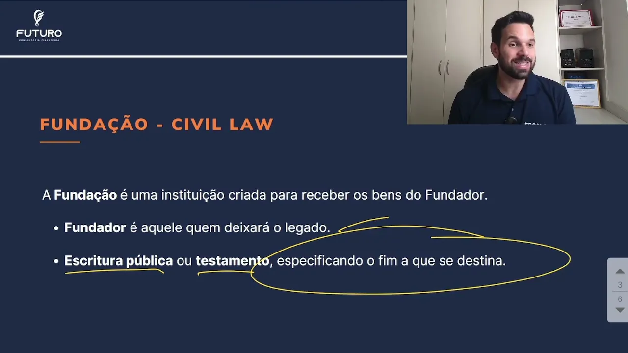 aquele indicado pelo cular que terá controle sobre o trusty né então vai ter ali um que vai garantir né que o trusty está seguindo a letter of wish beleza bom a fundação ela segue a civil Law tá então então a fundação é uma instituição criada para receber os bens do fundador fundador é aquele que deixará o legado Escritura pública ou Testamento especificando o fim a que se destina tá bom e a Hold né que é muito comum é um tipo de organização que permite que uma empresa e seus diretores controlem ou exercem influência em outra
